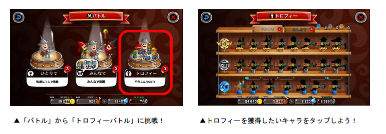 「トロフィーバトル」は、各キャラのトロフィー獲得を目指して、全国のプレイヤーとバトルを行ないます。