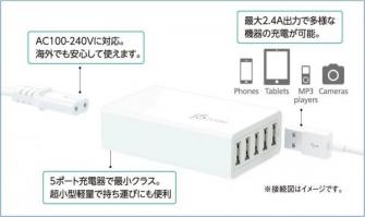 の高出力で5ポートすべてが最大2.4A出力に対応し、5台の機器が同時にフルスピード充電可能な「JUP50」