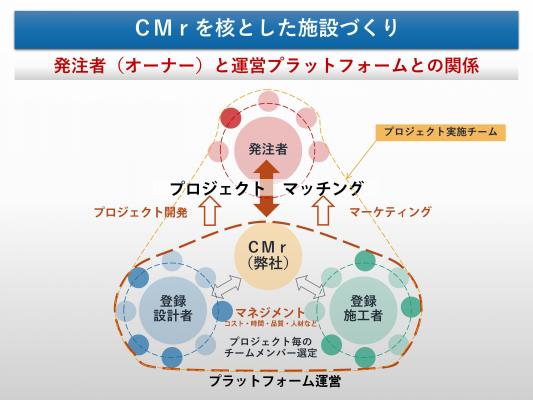 「発注者」へは、新しい建築発注システムによる施設づくり、「設計者、施工者」へは、新しいプロジェクトとのマッチング機会の提供、「発注者、設計者、施工者」へは、コンストラクションマネージャー(CMr)によるコンストラクションマネジメントを提供し、各ユーザーの独自業務のクオリティを高めます。