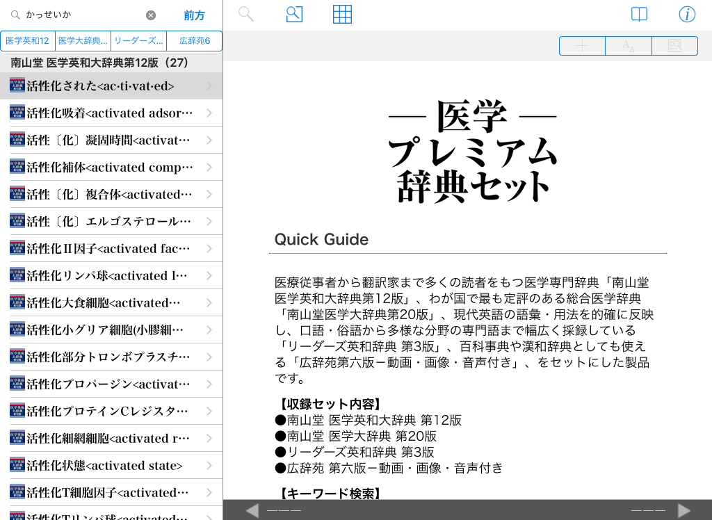 わが国で最も定評のある総合医学辞典「南山堂医学大辞典第20版」、医療従事者から翻訳家まで多くの読者をもつ医学専門辞典「南山堂 医学英和大辞典第12版」、現代英語の語彙・用法を的確に反映し、口語・俗語から多様な分野の専門語まで幅広く採録している「リーダーズ英和辞典 第3版」、百科事典や漢和辞典としても使える「広辞苑第六版-動画・画像・音声付き」、をセットにした製品です。