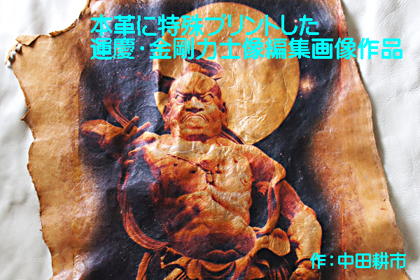 作品1=金剛力士像撮影+画像アート編集+背景小宇宙作成+革キャンパス特殊プリント