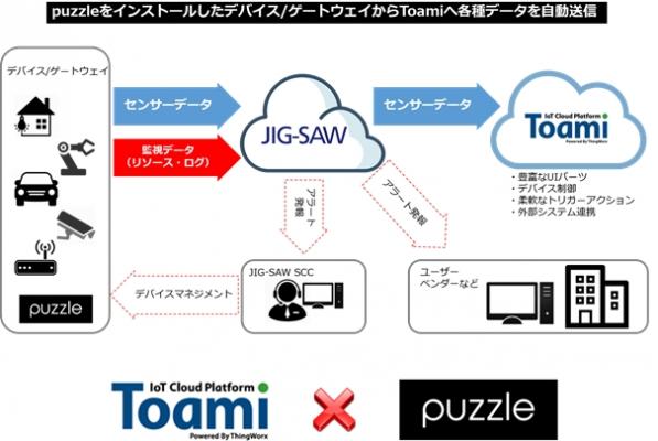 このような、センサーデータと、デバイスのリソースデータという種類の違うデータを同時に収集し、データの蓄積・表示・分析などのデータ活用がスピーディーに実現でき、コストも抑えたプラットフォームを実現するために、NSWが提供するIoTクラウドプラットフォーム「Toami(トアミ)」と、JIG-SAWが提供するマルチデバイス自動監視システム「puzzle」のサービス連携を実現いたします。
