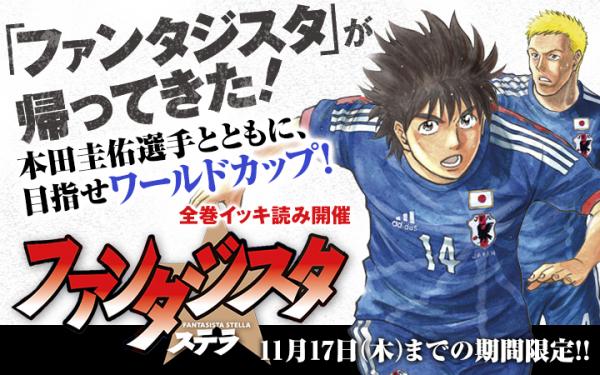 小学館発のコミックアプリ「マンガワン」はサッカー日本代表を応援します! 11月11日(金)の国際親善試合オマーン戦と、15日(火)のW杯ロシア大会アジア最終予選B組のサウジアラビア戦の応援企画として、2016年11月11日(金)~17日(木)まで、本田圭佑選手本人が登場する「ファンタジスタ ステラ」を期間限定で「マンガワン」にて全巻公開致します。本田圭佑選手の物真似で知られるじゅんいちダビットソンさんも愛読していた本作を読んで、サッカー日本代表を応援しましょう!