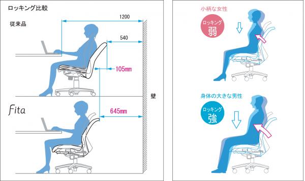 背もたれのロッキングの強さを座る人の体重に応じて自動調節する「体重感知式ロッキング」を備えています。小柄な方から身体の大きな方まで理想的なロッキングの強さを実現するので、不特定多数の人が座るフリーアドレスや会議室などで大きな強みを発揮します。
