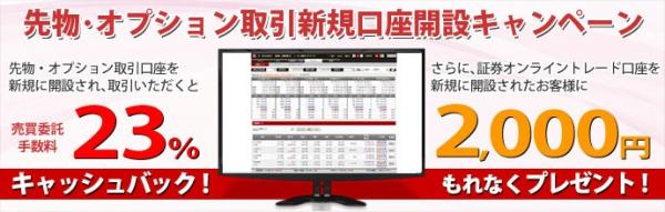 この度当社では、2016年11月14日(月)よりサービスを開始した株価指数先物・オプション取引におきまして、新規に口座開設されたお客様を対象に、期間中に発生した売買委託手数料の23%相当額をキャッシュバックさせていただくキャンペーンを実施いたします。さらに、証券オンライントレード(セルフコース)をセットで開設されたお客様には、もれなく「2,000円」をプレゼントさせていただきます。この機会に是非、先物・オプションおよび証券オンライントレード(セルフコース)の口座開設をご検討ください。