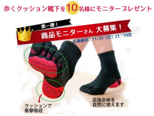 足裏の指付根、母趾球、かかとをしっかりサポート!「歩く」クッション靴下の≪第1回 商品モニター大募集!≫がスタートしました。運営するのは「心からほっとする健康と癒し」をコンセプトに商品展開する株式会社ほんやら堂(本社:群馬県高崎市 代表取締役:藤永辰美)