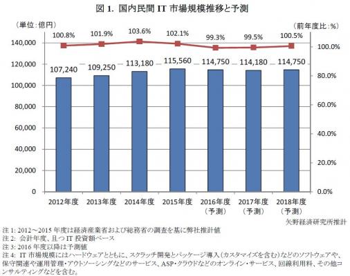 ◆2016年度の国内民間企業のIT市場規模は前年度比0.7%減の11兆4,750億円と予測、国内民間企業のIT投資は縮小の見通し