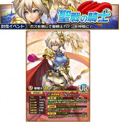 イベントクエスト「聖戦の騎士」でボスを撃破し、限定UR「聖騎士カノン」をゲットしよう!さらに、ボス撃破後に一定確率で出現するレアボスを撃破すると高確率で限定UR「聖騎士カノン」がゲット可能!