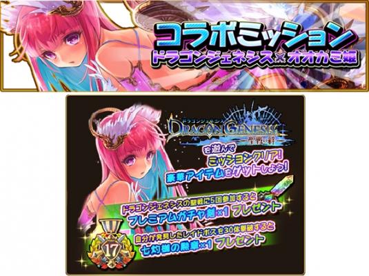 コラボ期間中に『ドラゴンジェネシス』をプレイすると、聖戦参加回数やレイドボス撃破数でオーブや勲章、ガチャ剣などがもらえるコラボミッション開催中!