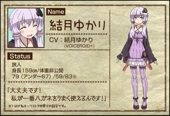 今回、『VOICEROID』シリーズの結月ゆかり、弦巻マキは、ゲーム内でのチュートリアルを解説するキャラクターとして登場するほか、放映中のアニメ『はがねオーケストラ』第8話(11月27日放映予定)にもアニメ史上初のVOICEROID音声として登場する予定です。音声には音声合成AITalk(R)が利用された『VOICEROID+ 結月ゆかり EX』、『VOICEROID+ 民安ともえ(弦巻マキ)』で作成された音声が使われており、結月ゆかりと弦巻マキの二人が中心の実況動画で有名なきゆみやまさんと、結月ゆかりの生みの親の一人、ボカロマケッツのちょむPさんが調声を担当されます。
