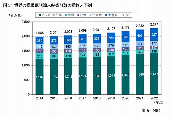 世界の携帯電話端末(スマートフォンを含む)の販売台数は、2014年度の19億8,800万台から2022年度には22億7,700万台へとゆるやかに成長する。