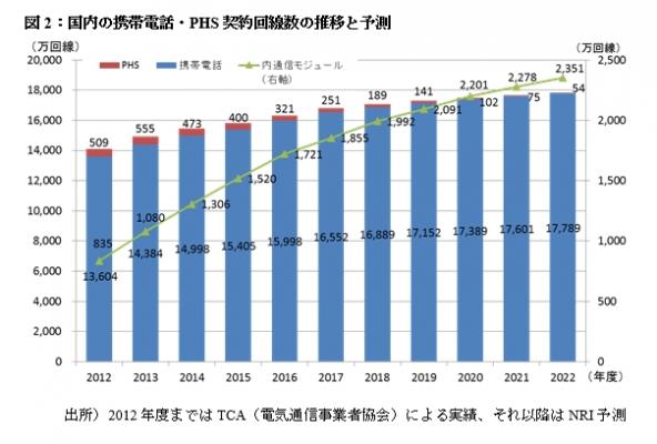 携帯電話の契約回線数は、タブレット端末および通信モジュールが組み込まれた機器の増加、多様なMVNO(Mobile Virtual Network Operator、仮想移動体通信事業者)の登場などにより、2015年度の1億5,405万回線から2022年度には1億7,789万回線に増加する。