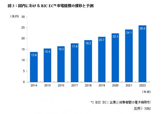 B2C EC(企業と消費者間の電子商取引)市場は、2015年度には15.4兆円となり、2022年度には26兆円に達する見込み。携帯端末の普及に伴い、自宅のパソコンからだけではなく、時間や場所を問わずにECを利用できるようになってきたことが、市場の成長を後押しする。