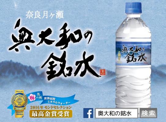 採水地が奈良県月ヶ瀬のミネラルウォーター『奥大和の銘水』。ロゴタイプは、奈良を代表するにふさわしい国宝・東大寺の最高位の僧侶である、第219世別当・上野道善師の直筆