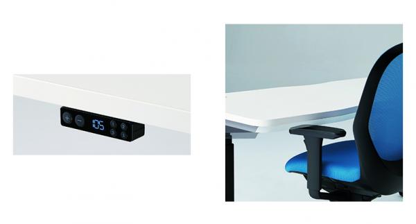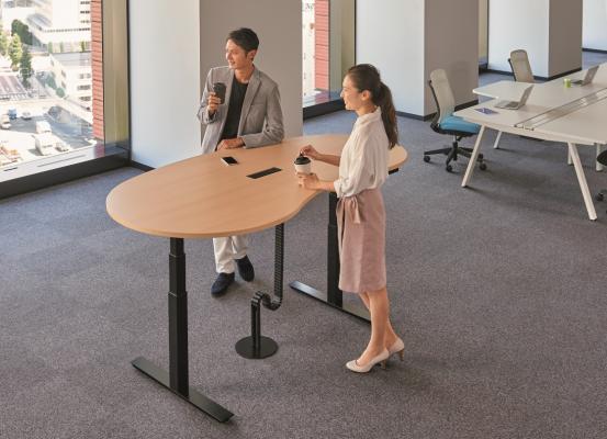 小柄な女性の「座位」を想定した650mmから、大柄な男性が「立位」で作業できる1250mmまで、ボタンひとつでスムーズに天板の高さを電動調整。立ったり座ったりの作業により、気分転換や疲労の軽減を促し、姿勢を随時変えられる自由なワークスタイルを実現します。また立って作業することで周囲の人と目線が近くなってコミュニケーションを取りやすくなったり、発想や気分を変えられたり、さらに短時間の集中ミーティングでスピーディーな決断を促進したり等、作業効率のアップが期待されます。