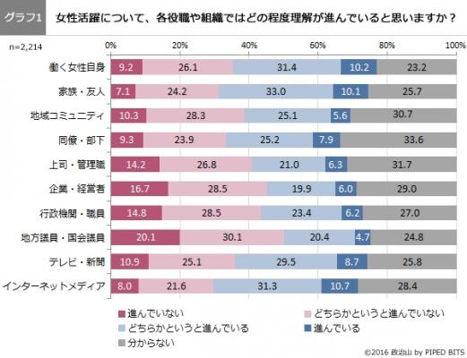株式会社パイプドビッツ(東京都港区、代表取締役社長CEO 林哲也、東証1部パイプドHDグループ<証券コード3919>、以下「パイプドビッツ」)が運営する、政治・選挙情報サイト「政治山(せいじやま)」は、2016年11月11日から11月17日にかけて、全国の20歳以上の男女を対象に、女性活躍に関する意識調査を実施し2,214名から回答を得ました。本日11月25日に「政治山」で調査結果のサマリー版を公開しましたので、お知らせいたします。