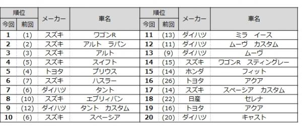 先月に引き続き、「ワゴンR」「アルト」「スイフト」が1、2、3位。スズキ勢の上位独占状況が引き続き続いております。そんな中注目は、久々のランキング登場の登場のスズキ「ソリオ」