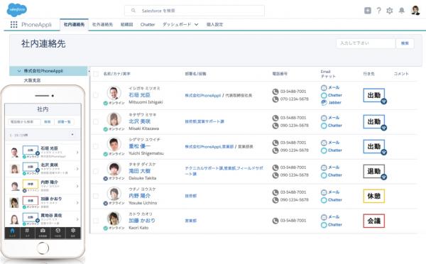 「PhoneAppli」はSalesforceのクラウド基盤上にて提供されるサービスとして「社員の連絡先・組織情報」と「顧客の連絡先」という社内外の連絡先情報がセキュアに管理され、且つSalesforceが提供するコミュニケーション機能やCRM機能との連携を考慮した新しい連絡先サービスです。Salesforce for everyoneをサービスコンセプトに全社員でSalesforceを基盤として活用することを前提とした設計で、連絡先・名刺などの機能を1ユーザ月額300円(税別)にて提供いたします。