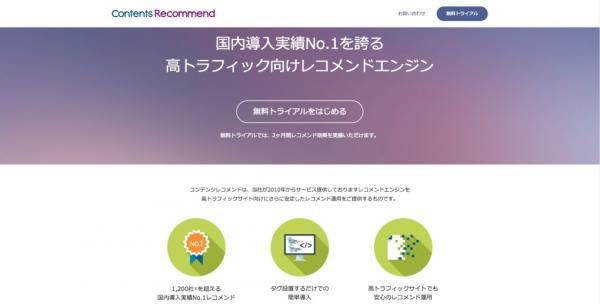 「コンテンツレコメンド」は、これまでECサイトでの定番機能であったレコメンド機能を、情報サイト、コーポレートサイト、求人サイト、不動産サイト等の高トラフィックサイトに簡単、低コストで導入できるサービスです。