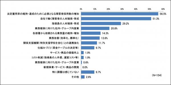 障がい者が担当している業務の運営に関する課題として、特例子会社を持たず自社で障がい者を雇用する上場企業は、「法定雇用率の維持・達成のために必要となる障害者採用数の増加」(56.5%)を挙げる割合が最も多く、次いで「自社で働く障害者の人材確保・育成」(51.3%)が課題であると回答しました(複数回答、図3)。