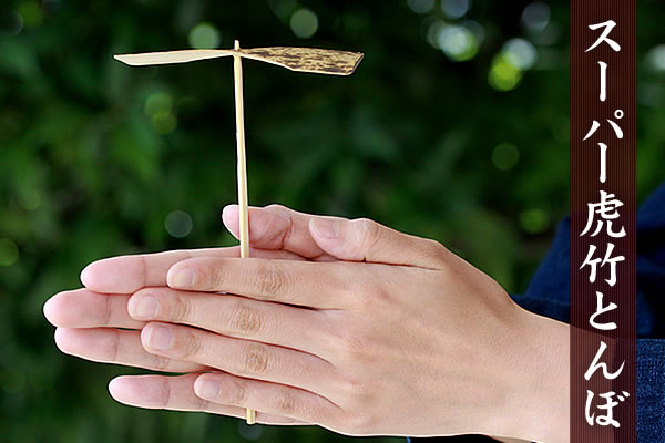 竹トンボは簡単に作れて遊べることから昔から日本で親しまれている玩具の一つです。竹虎より、虎斑竹を使ったスーパー虎竹とんぼが、ねじり羽根にこだわって登場しました。通常の竹トンボより良く飛びます。
