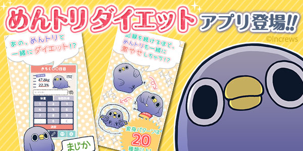 株式会社インクルーズ(東京都新宿区、代表取締役 山崎 健司)は、株式会社セプテーニ・クロスゲート(東京都新宿区、代表取締役社長 高野 真行)と共同開発し、2016年12月21日(水)よりiTunes App Store内にて『めんトリダイエット -面倒だがトリあえず体重記録-』(iOSアプリ)、『それいけ!めんトリ ~骨なしチキンの冒険~』(iOS、Androidアプリ)の2本同時配信を開始いたしました。