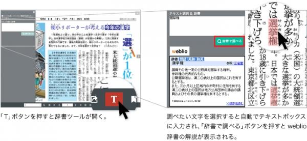 閲覧者はわからない言葉の意味を調べるために別アプリケーションやブラウザをあらたに起動することなく瞬時に意味を調べることができます。調べたい言葉はマウスを使ってデジタルブック上で文字を選択するか、あるいは、辞書に直接文字入力します。 搭載されたweblio辞書には、「辞書」「類語」「英和・和英」が用意されており、さらに詳しい内容を調べたい場合は、「続きを読む」からweblioのWebサイトに遷移します。