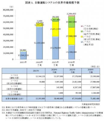 自動運転システムはNHTSA(米国運輸省高速道路交通安全局)が自動化のレベルを0~4までの5段階で分類している。レベル1は運転支援機能であり、現在普及の進んでいるADAS(先進運転支援システム)が該当する。車両の周辺の状況をセンサが検知し、衝突事故を回避する自動ブレーキ(AEB)、前方車両に追従するオートクルーズコントロール(ACC)などがある。レベル2は部分的な自動化であり、操舵や加減速のうち複数の運転支援を実行し、他の動的運転作業はドライバーが行う。レベル3は条件付自動化であり、自動運転システムが全ての動的運転作業を実施し、緊急時においてはドライバーが介入する。レベル4については完全自動運転としており、自動運転システムが全ての動的運転作業を実施し、ドライバーはいかなる状況においても運転作業に関与しない。なお、市場規模は新車における乗用車および車両重量3.5t以下の商用車に搭載される自動運転システムの搭載台数ベースで算出している。