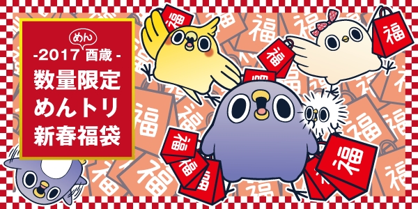「めんトリ」の活躍がさらに期待される2017年酉歳、新年早々、公式「めんトリ」グッズを詰め込んだ福袋を数量限定で販売致します。福袋は2種類あり、総額17,000円相当が入った10,000円の福袋と、なんと「2周年記念 めんトリぬいぐるみセット」が入って、総額50,000円相当が30,000円の超福袋としてご用意!!