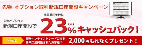 この度当社では、2016年11月14日(月)よりサービスを開始した株価指数先物・オプション取引におきまして、新規に口座開設されたお客様を対象に、期間中に発生した売買委託手数料の23%相当額をキャッシュバックさせていただくキャンペーンを実施いたします。さらに、証券オンライントレード(セルフコース)をセットで開設されたお客様には、もれなく「2,000円」をプレゼントさせていただきます。この機会に是非、先物・オプションおよび証券オンライントレード(セルフコース)の口座開設をご検討ください。