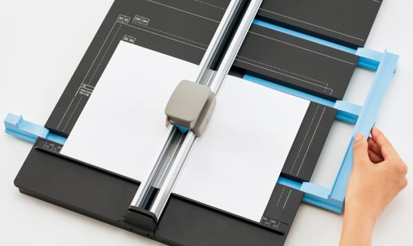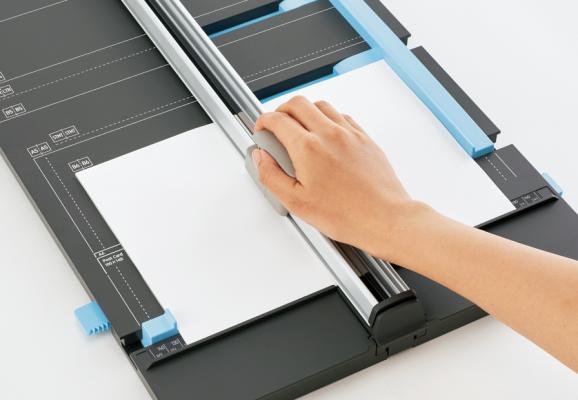 ※1紙の中央を切れる(左右のゲージで紙を両端から挟み込むことにより)手動裁断機として世界初。北米、欧州、アジア、オセアニア、南米地域の主要国のWEBサイト調査 (2016年9月~11月 当社調べ)。