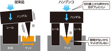 カッターマットの形状を従来の板状から逆三角形にすることで、本体との隙間をゼロにしました。マットがズレず、刃が同じ軌道を通るので 蛇行が起こりにくく、より切りやすくなりました。