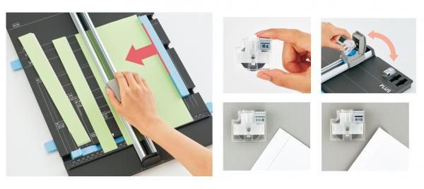 通常の直線に切る刃のほかに、「ミシン目」「折り目」の替刃をご用意しています。キリトリ線用のミシン目を付けたり、小冊子やリーフレットを作るのには折り目線が便利。本体に替刃の保管スペースも備えています。