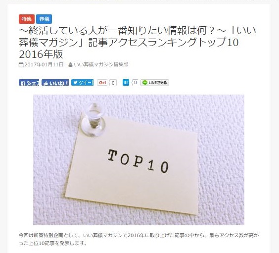 日本最大級の葬儀総合サイト「いい葬儀」を運営する株式会社鎌倉新書(本社:東京都中央区、代表取締役社長:清水祐孝)は、終活をしている全ての方に向けて発信している、終活WEBメディア「いい葬儀マガジン」の2016年記事アクセスランキングトップ10 を2017年1月12日に発表いたしました。