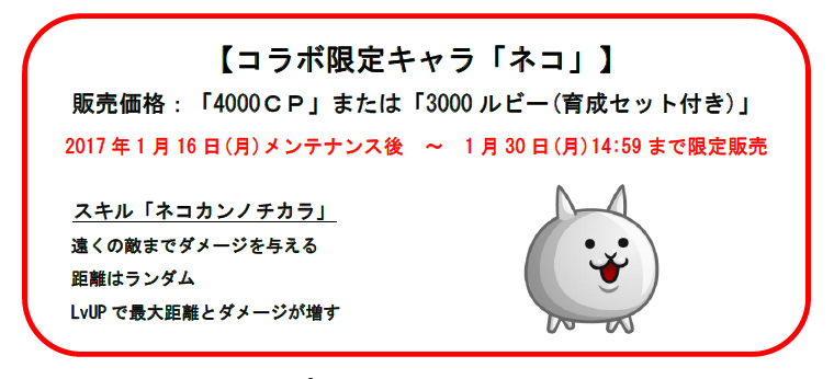 『にゃんこ大戦争』とのコラボイベント開催を記念して、最大700ルビーや800CPがもらえる