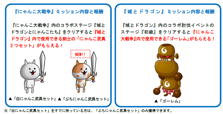 期間中に『にゃんこ大戦争』と『城とドラゴン』でそれぞれのミッションをクリアすると、各ゲーム内で