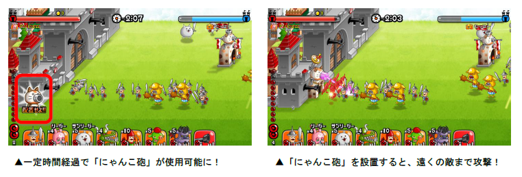 ・バトル開始後、一定時間経過で「にゃんこ砲」が使用できるようになります。