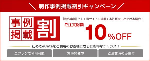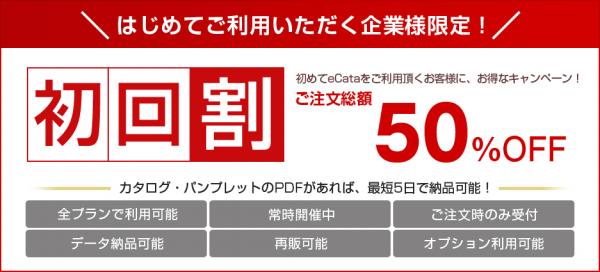 初めてeCataサービスをご利用いただくお客様に限り、ご注文総額から50%割引させていただきます。