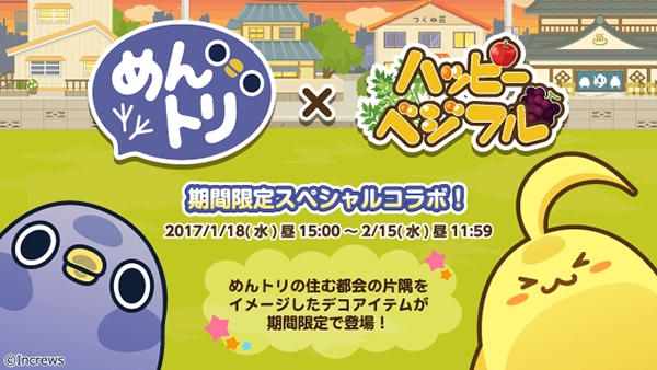株式会社インクルーズ(東京都新宿区、代表取締役 山崎 健司)は、大ヒットLINEスタンプ「面倒だがトリあえず返信」のキャラクターである「めんトリ」と、農園育成ゲーム「ハッピーベジフル」とのコラボレーションイベントを本日2017年1月18日より開始されますことをご報告いたします。