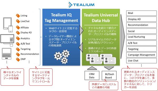 業界最先端のTealiumユニバーサルデータハブは、エンタープライズタグマネジメント、オムニチャネル顧客セグメンテーション、アクションエンジン、リッチデータサービスから成り、ウェブやモバイル、オフライン、IoTをすべて統合させるベンダーニュートラルなデータ基盤を構成します。