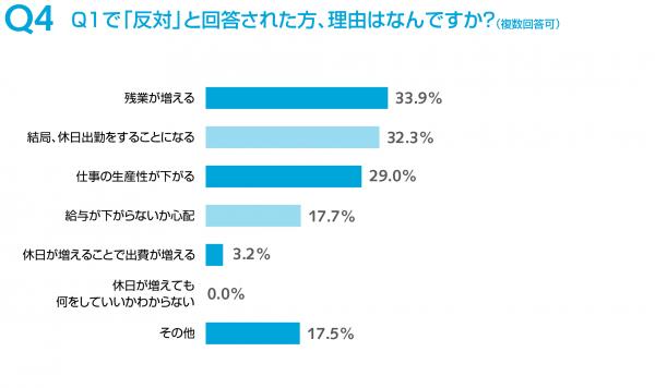 もう一方で「反対」(20%)の主な理由は「残業が増えそう」(34%)、「結局、休日出勤をすることになりそう」(32%)、次いで「仕事の生産性が下がる」(29%)と生産性維持への懸念を持つ回答者が多いほか「その他」を選んだ回答者からは「社会の足並みがそろわなければ難しい」というコメントも寄せられ、導入に際しては環境整備やフィンテック、IoT導入など生産性アップに向けた企業の取り組みが一層求めらることを示唆しています。また、今回の調査では休暇取得をめぐる企業文化改善の必要性を指摘する声も多く寄せられました。