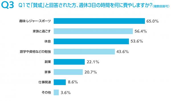 休日3日間の使い道では、「趣味・レジャー・スポーツ」(65%)、「家族と過ごす」(56%)が多く、生活を豊かにすることで仕事での充実感や向き合い方への意識改善にも期待が持てるほか、仕事のアイデア源ともなり得る体験に休日を費やそうといった考えも見受けられます。これは、次々点の「語学や資格などの勉強」(43.6%)と並び導入検討中の企業が期待するアウトプットのクオリティ向上にも十分な期待が持てることを示唆します。