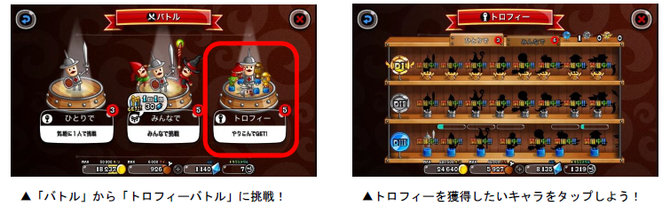 各キャラのトロフィー獲得を目指して、全国のプレイヤーとバトルを行なう「トロフィーバトル」を