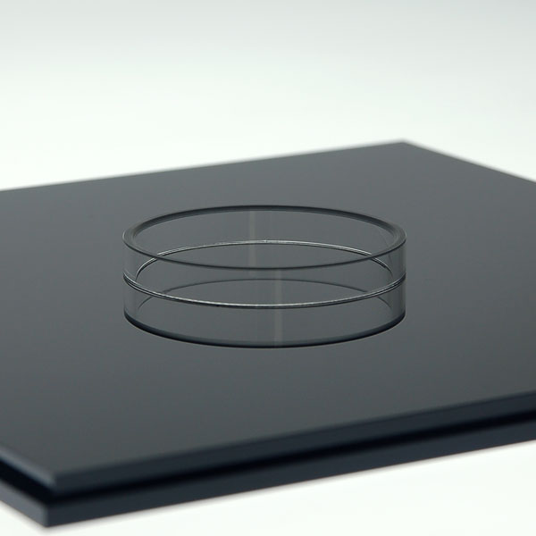 付属の台は5mm厚のアクリル板を2枚貼り合わせた重厚な作りになっています。艶のあるブラック色を使う事で、重厚感に加えて高級感も演出します。