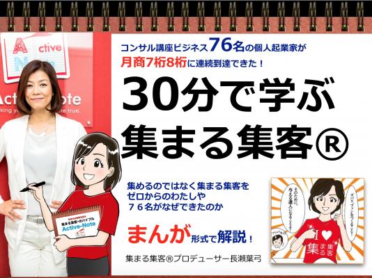 個人起業家のビジネスプロデュースを手掛ける株式会社アクティブノート(本社:東京都新宿区 代表取締役 長瀬葉弓)は、2017年1月31日の創業6周年を記念して、電子書籍『コンサル講座ビジネス76名の個人起業家が月商7桁8桁に連続到達できた!30分で学ぶ 集まる集客(R)』無料配布開始キャンペーンを開始します。