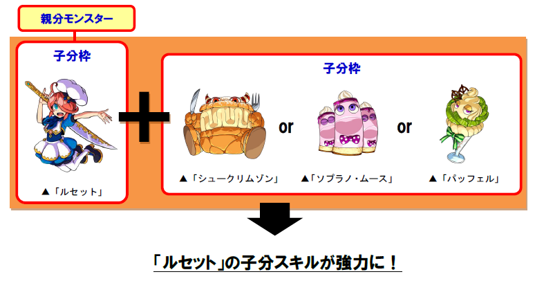 同じモンスターの子分として同時に装備させると、「ルセット」の子分スキルが強力になります。