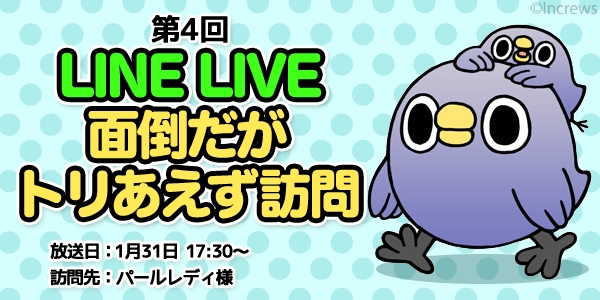 株式会社インクルーズ(東京都新宿区、代表取締役 山崎 健司)は、LINEスタンプ「面倒だがトリあえず返信」の大人気キャラクターによる「めんトリ」のLINE LIVEロケバラエティ番組「面倒だがトリあえず訪問」第4回目を2017年1月31日(火) 17:30より放送いたします事をご報告致します。