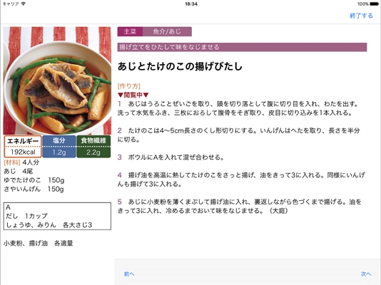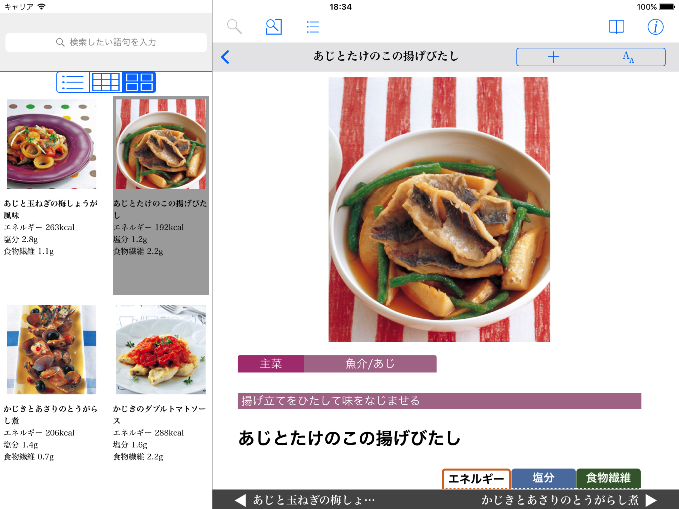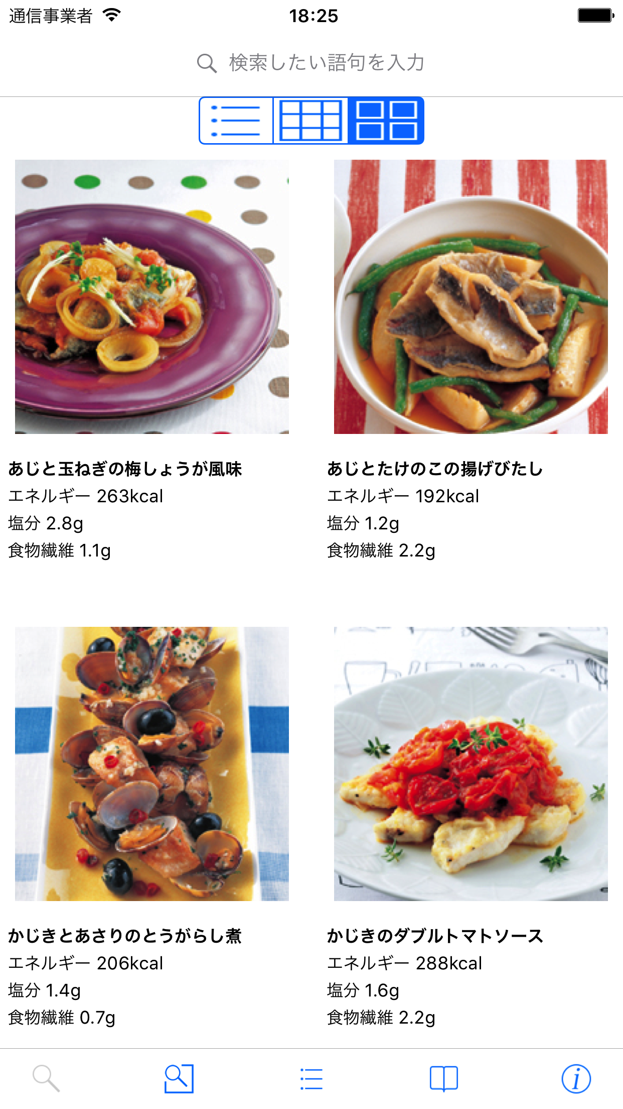 ●検索結果は料理の写真付き。さらに写真のみやエネルギー量、塩分量、食物繊維量表示の切り替えができます。