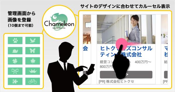 カメレオンはDSPやアドネットワークが有するインバナー枠をカルーセルに変え、さらに配信先メディアのデザインに合わせて自動で「溶け込む」ことにより、ユーザーにストレスなく商材のメッセージを伝えることができる画期的なフォーマットを提供します。