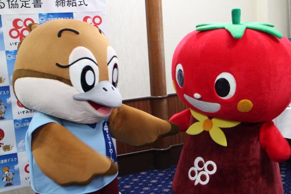 <画像3> 大阪「超」盛り上げ共同声明を調印した大阪府広報担当副知事「もずやん」といずみ市民生協のキャラクター「とまとちゃん」